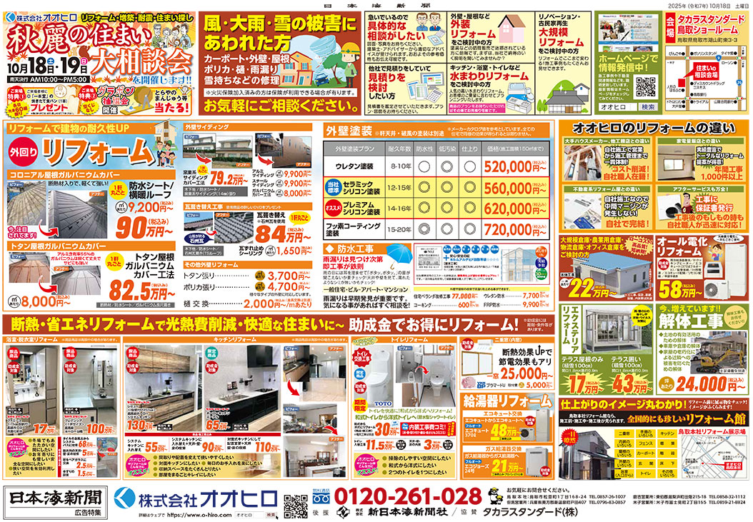 ホーム > お得な情報が満載!!イベント・チラシ情報 秋麗の住まい大相談会を開催致します!! ※画像をクリックすると拡大します。 日時10月18日(土)・19日(日) 会場タカラスタンダード鳥取ショールーム 鳥取県鳥取市湖山町東3-3 時間10:00~17:00 鳥取県鳥取市湖山町東3-3 10月18日・19日の両日、タカラスタンダード鳥取ショールームにて住まい大相談会を開催いたします。 耐震システムバスをはじめ、限定特価商品を多数取り揃えてお待ちしております。 一本堂焼きたて食パンのプレゼントもご用意しております。 お気軽にお立ち寄りください。